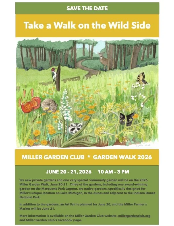 Our annual Garden Walk, a must-see show of flora and fauna sure to please everyone! Saturday, June 20 and Sunday, June 21 from 10:00 am to 3:00 pm. "Take a Walk on the Wild Side": Six new private gardens and one very special community garden will be on the 2026 Miller Garden Walk. Three of the gardens, including one award-winning garden on the Marquette Park Lagoon, are native gardens, specifically designed for Miller’s unique location on Lake Michigan, in the dunes and adjacent to the Indiana Dunes National Park. In addition to the gardens, an Art Fair is planned for Saturday, June 20 and the Miller Farmer’s Market will be Sunday, June 21.